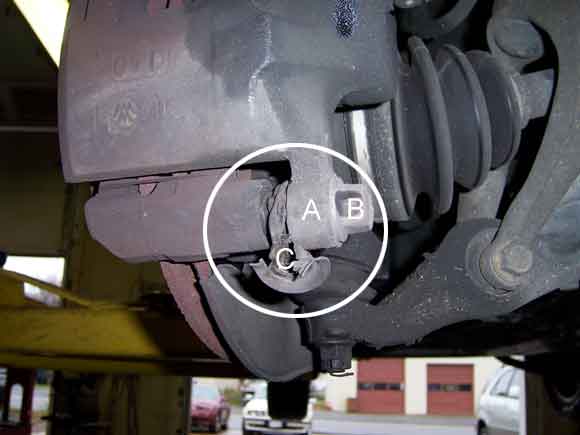 Customer came in complaining about the brake pedal being "spongey". When we checked the brakes we found the brake assembly in the above condition. Item 'C' in the image above shows the "dust boot" which is basically a rubber tunnel through which the pin (marked 'B') is placed before reaching the caliper when replacing the brakes. It protects the lubricated pin from dirt and debris that would otherwise become lodged in the lubrication causing the pin to lock up instead of being able to move freely. This condition is what caused the customer's brakes to stop functioning properly. The portion of the dust boot hanging down around the bottom of the circle shows the lip of the tunnel that should be pressed up against the part labled 'A' with the pin (marked 'B') going through the lip opening (marked 'C') and then through the rest of the dust boot and into the caliper. Instead, the pin was forced through the side of the boot, puncturing it and exposing the lubricated pin to the dirt and debris coming up from the road underneath the car. This will undoubtedly cause the pin to freeze up again and again in the future and the boot and pin should be replaced to repair the car properly.